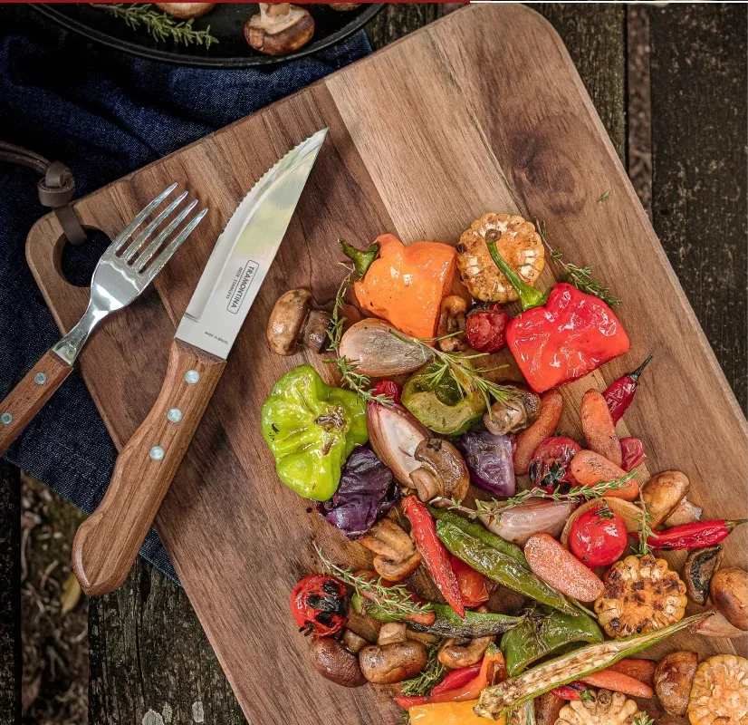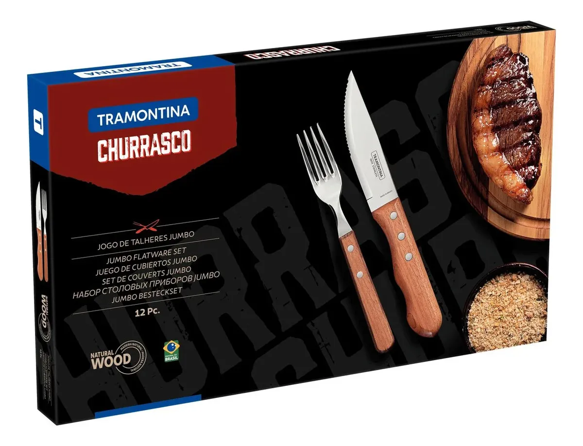 Para saborear un asado especial con la familia y los amigos, cuente con el juego para asado Tramontina Churrasco Dynamic con láminas en acero inoxidable y mangos de madera natural de 12 piezas. Fabricado para brindarle practicidad y belleza a su mesa, posee piezas producidas con láminas en acero inoxidable. Los cuchillos tienen más duración en su filo de corte, gracias al tratamiento térmico, y los tenedores cuentan con más resistencia debido al estampado. Sus mangos son de madera natural y poseen remaches de aluminio, que les otorgan un bellísimo diseño. ¡Elija su corte de carne preferido y comparta su mesa con Tramontina!